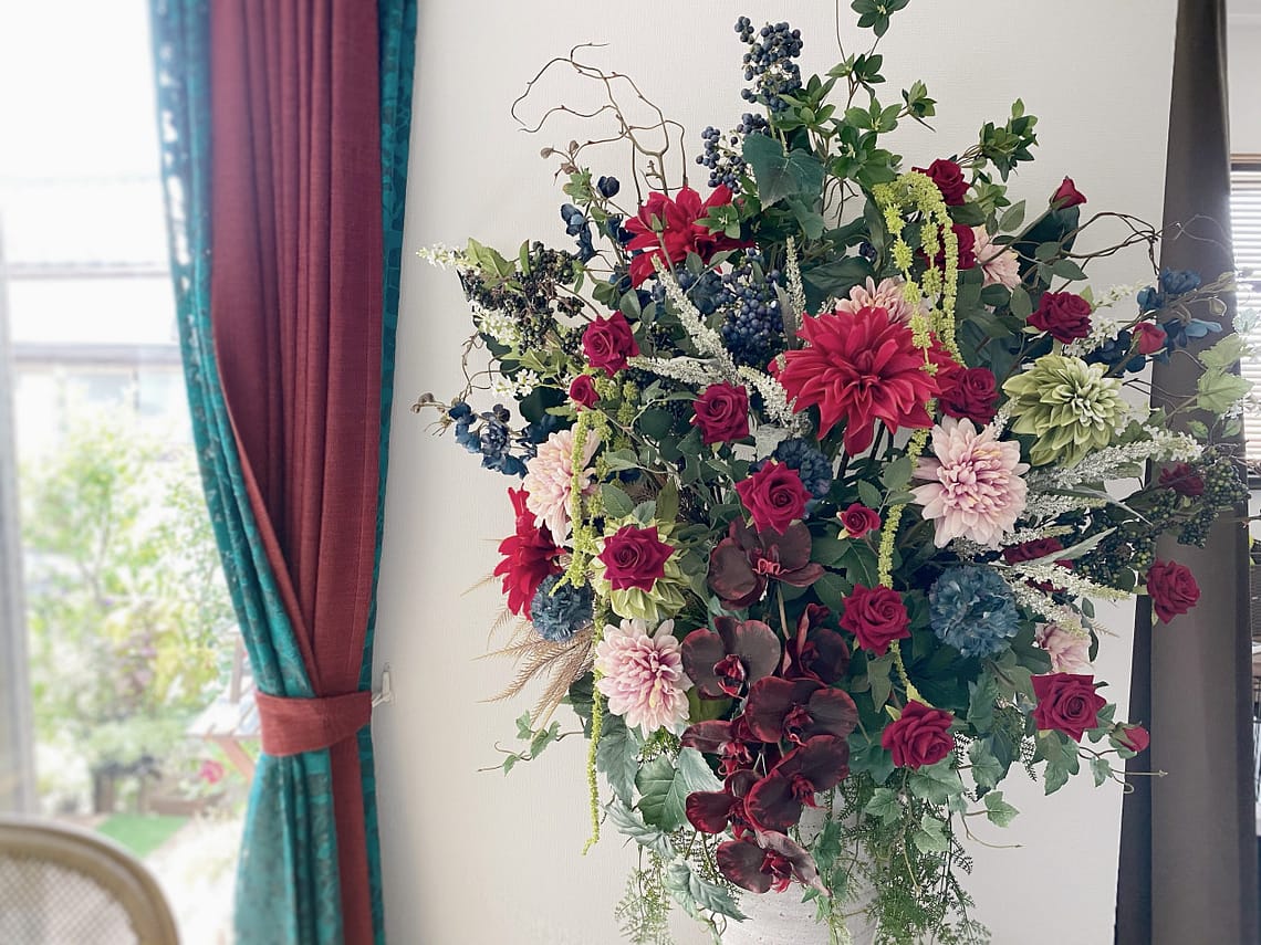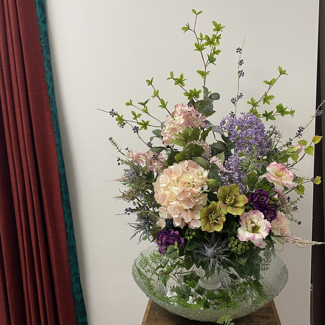 お客様をお迎えするエントランスなどにも、管理不要な造花アレンジは大変おすすめです。