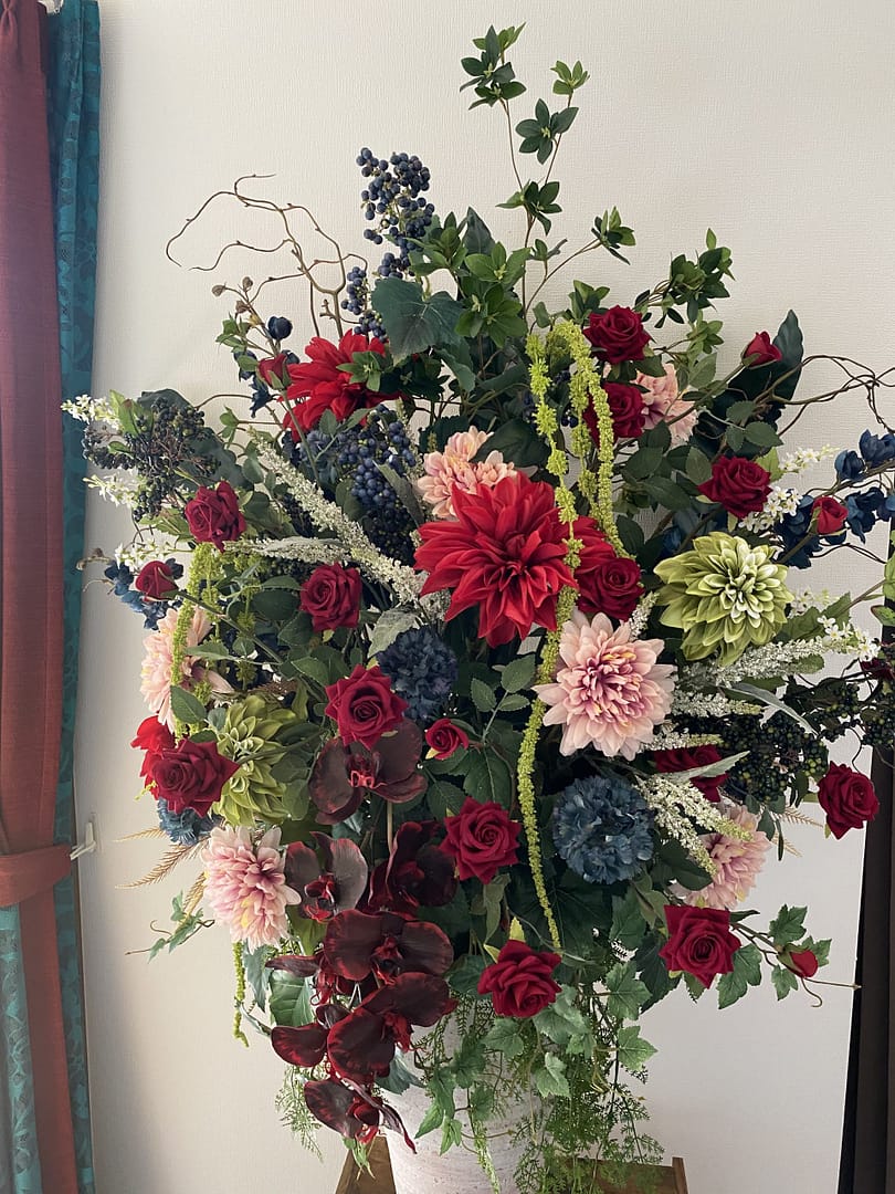 使用花材:ダリア・バラ・胡蝶蘭・アマランサス・デルフィニウム・ベロニカ・ベリー・カーネーション他