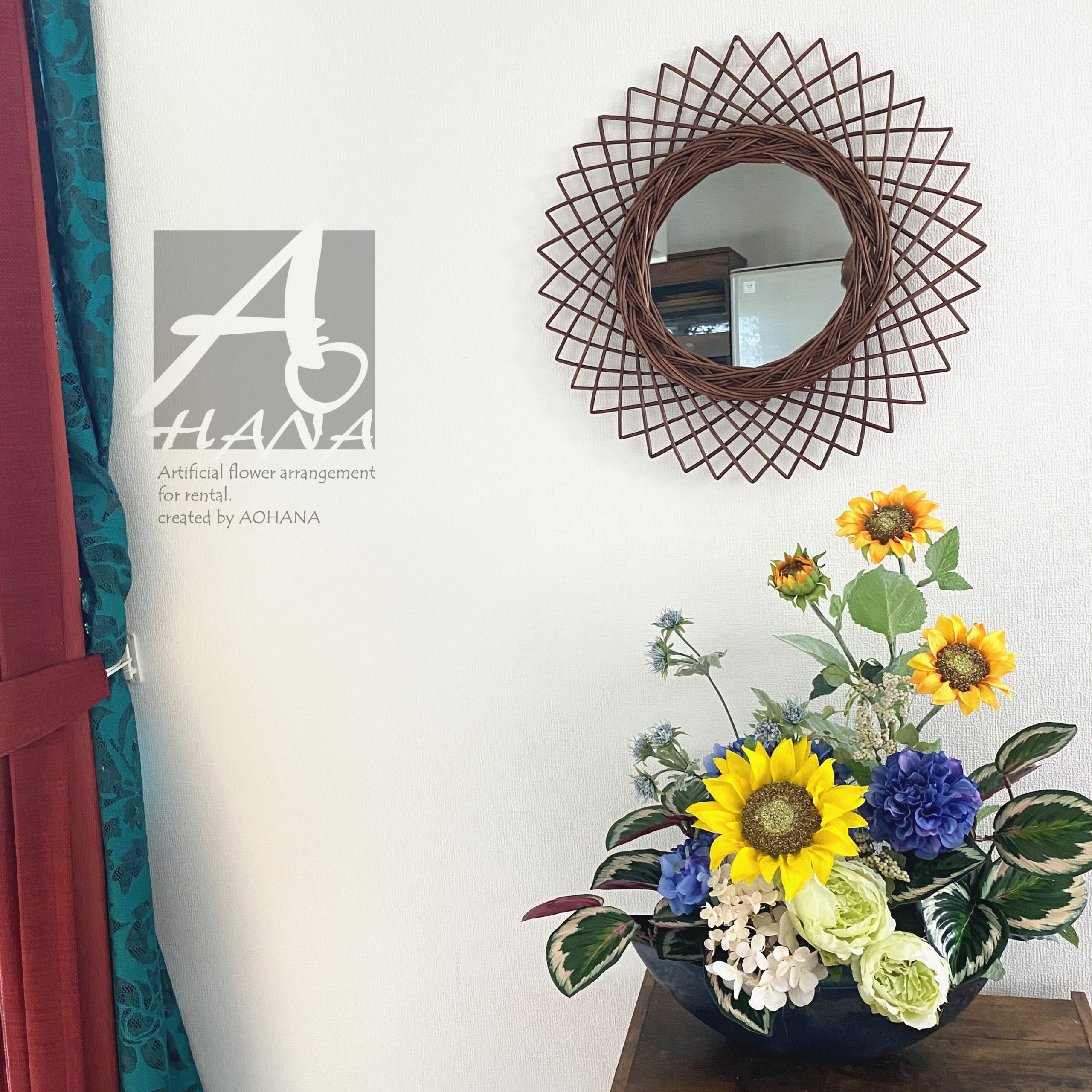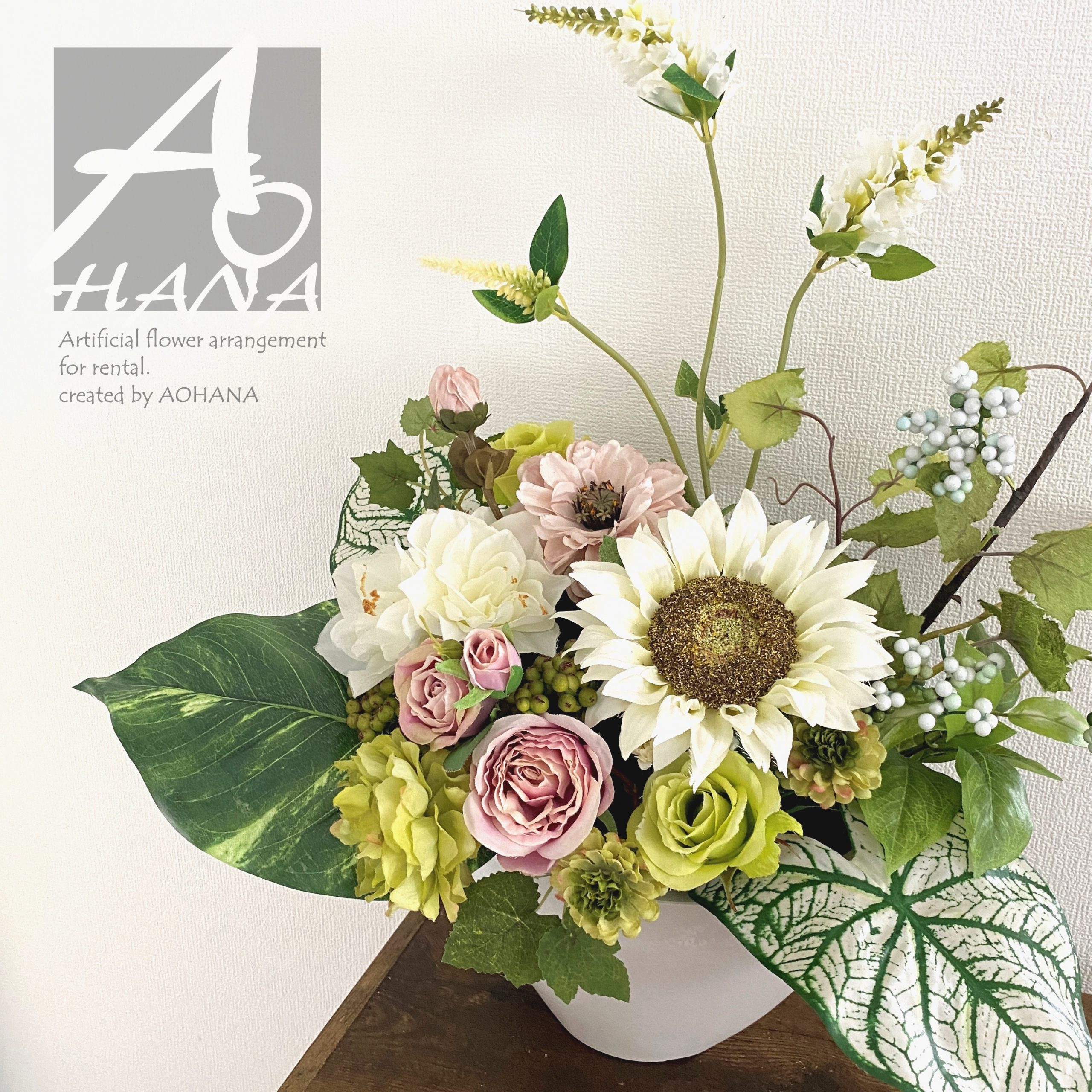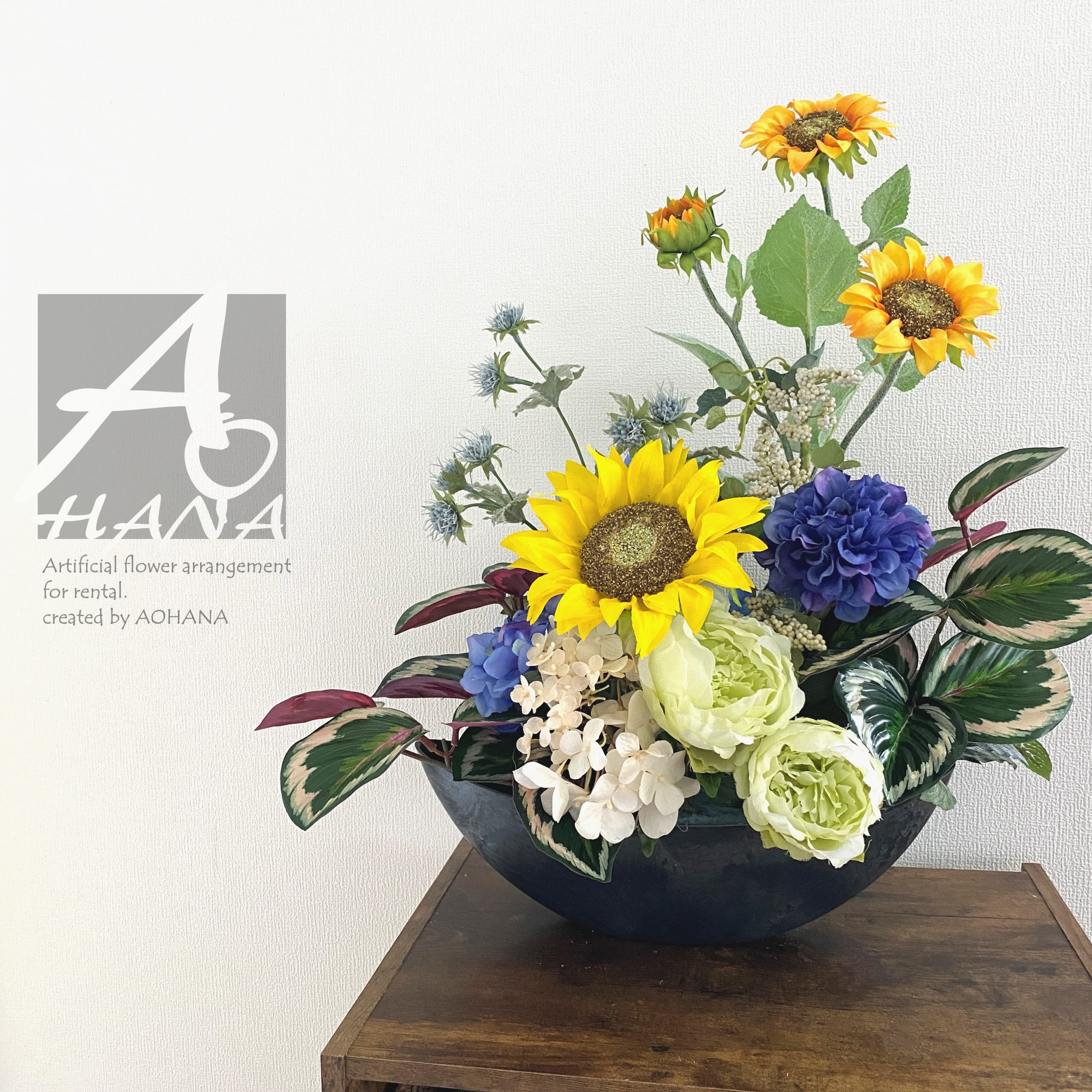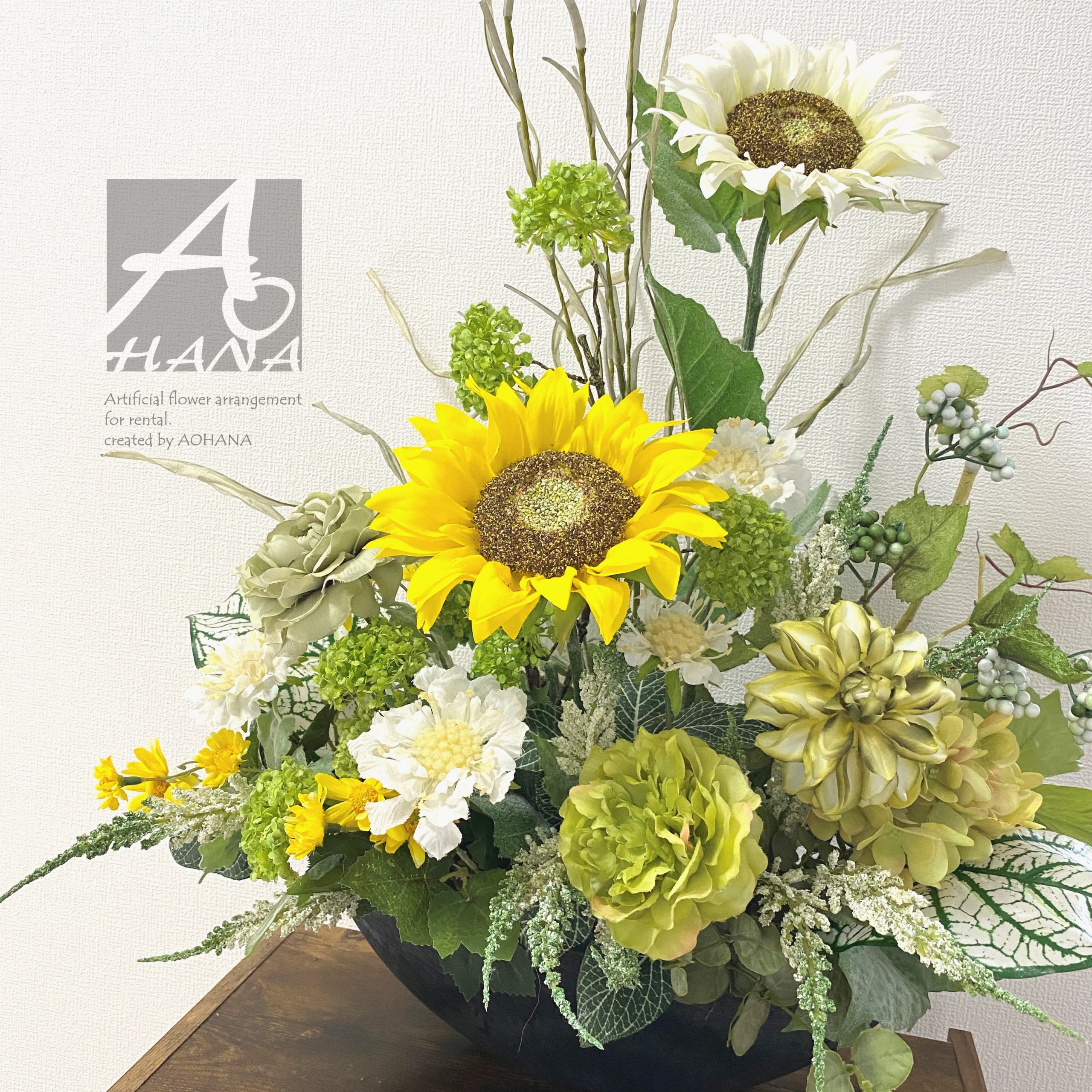 使用花材:向日葵・ダリア・ピオニー・アジサイ・カラテア他