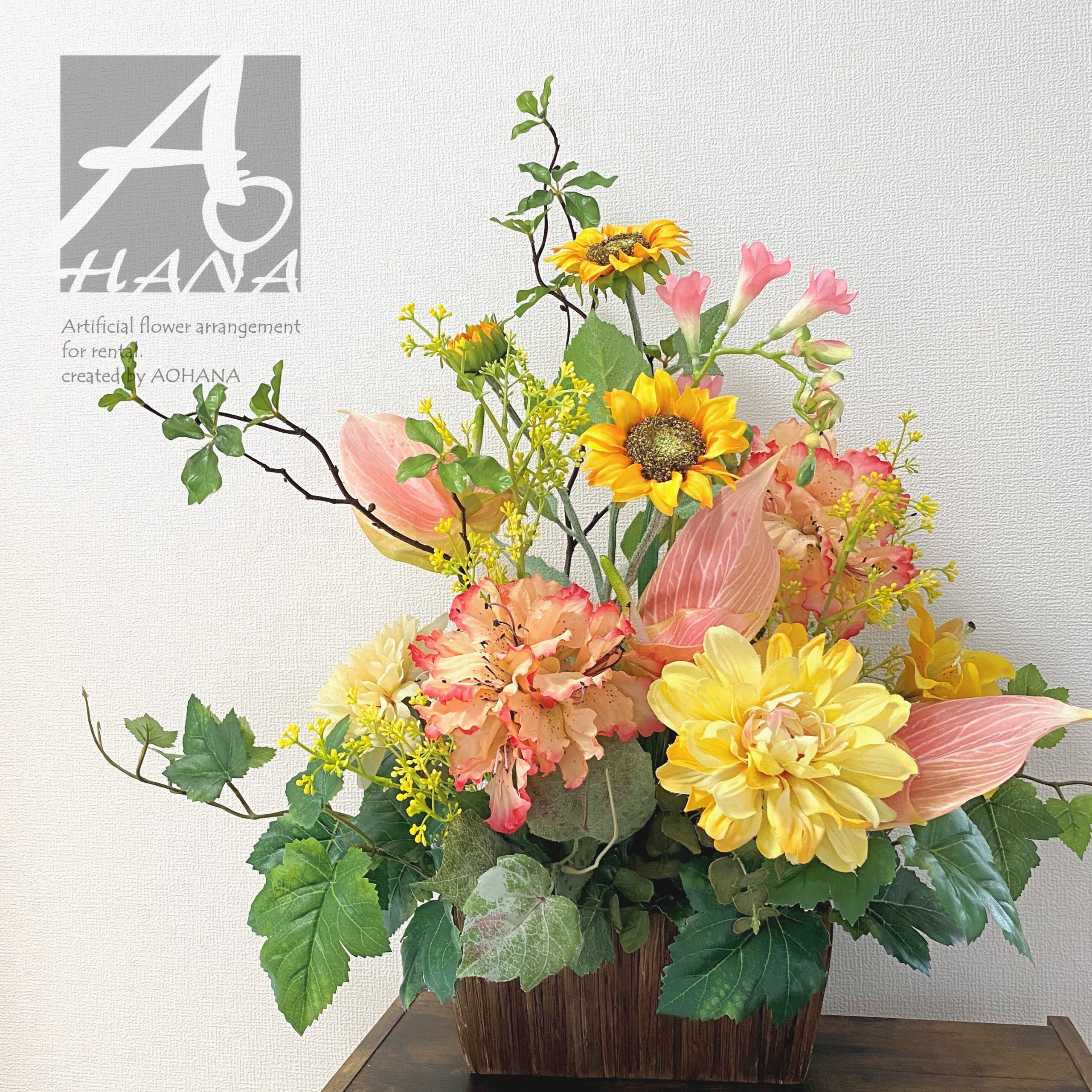 使用花材:向日葵・ダリア・アンスリウム・フリージア・ドウダンツツジ他