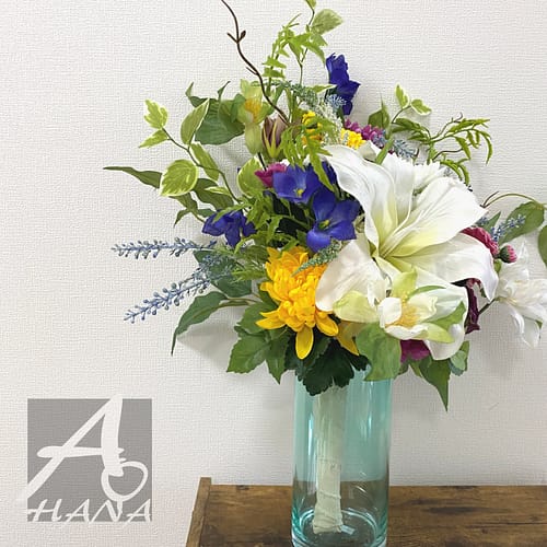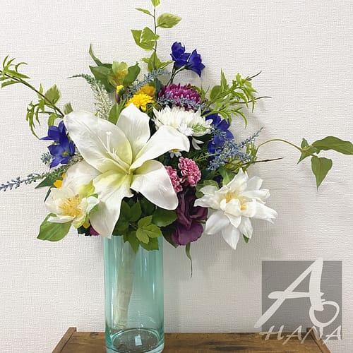 使用花材:オリエンタルリリー×1、大輪マム×1、マム×1、八重咲クレマチス×1、ベロニカ×2、トルコキキョウ×1、キキョウ×3、小菊×2、他