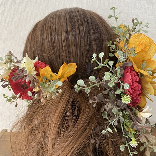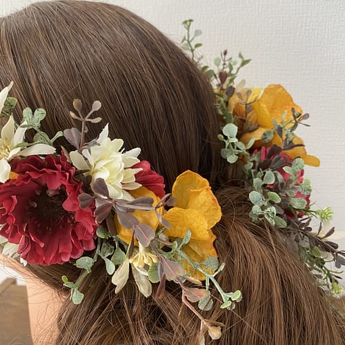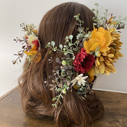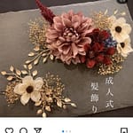 大きめのダリアに小さなお花を添えたメインの大きい髪飾りと、同じ花材を使った小さい髪飾りの2点セットで販売されている画像を頂きました。今回のお客様の場合は、デザインと大小セットが画像のイメージに近かったようですが、色合いが着物に合うものを見つけられなかったようです。