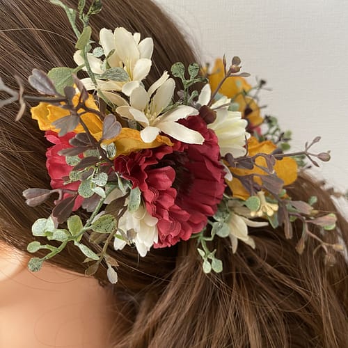 差し色の「赤」もくすみのあるダークレッドを。デージーはお着物の柄のポップな感じを表現できる丸くて可愛いお花です。サブの花材にピンポンマムを使うことが多い着物用髪飾りですが、デージーを使うことでレトロポップな雰囲気になったと思います。