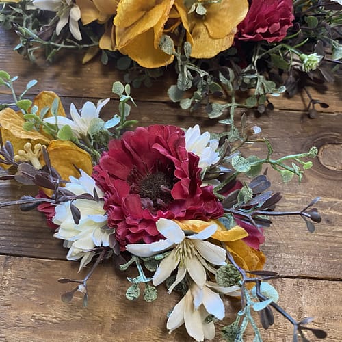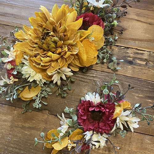 今流行のドライフラワーの雰囲気が少し感じられるように色味をくすみのあるトーンでまとめて、大ぶりなダリアもマスタードイエローを選び、派手すぎない落ち着いた雰囲気になるようにしました。