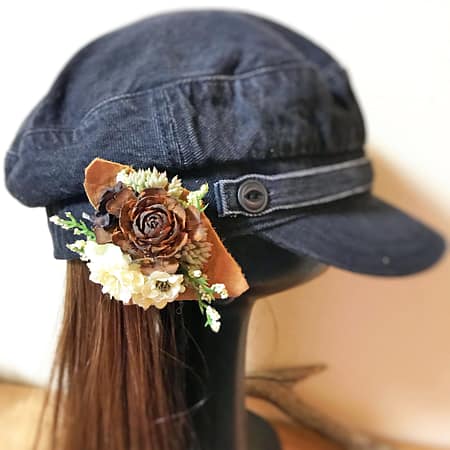 あとは、服や帽子、鞄など着けるものに安定してなじむようにピンとお花の間にレザー(リアルorフェイク)を使っています。