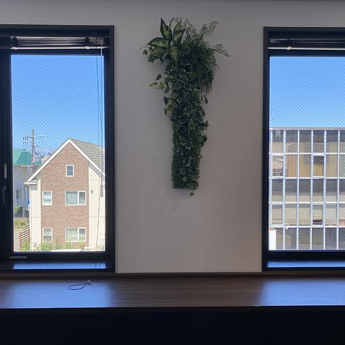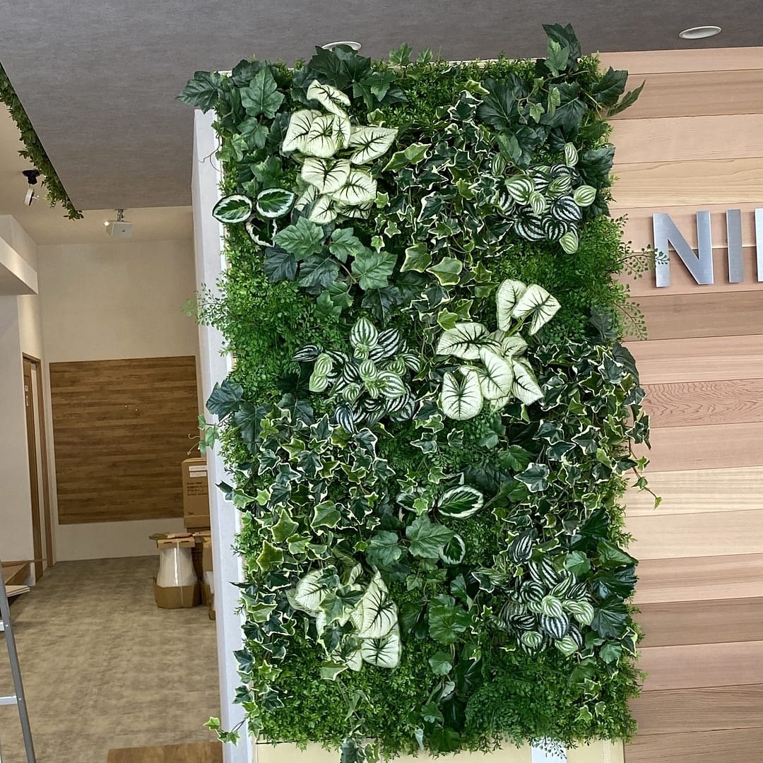 ショールーム受付をグリーンの壁面パネルで装飾しました。グリーン一色ではなく、白系のグリーンをプラスして明るい印象に仕上げました。土台はネットを使用しているので、重量も比較的軽く設置しやすい作りになっています。