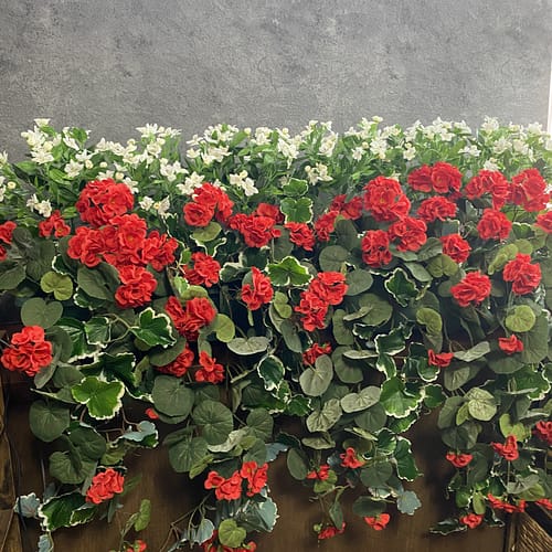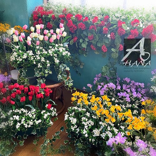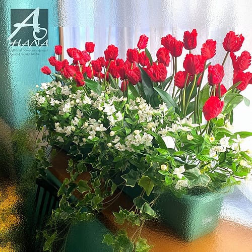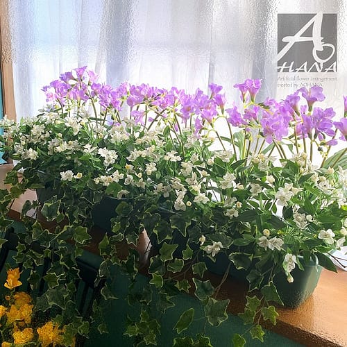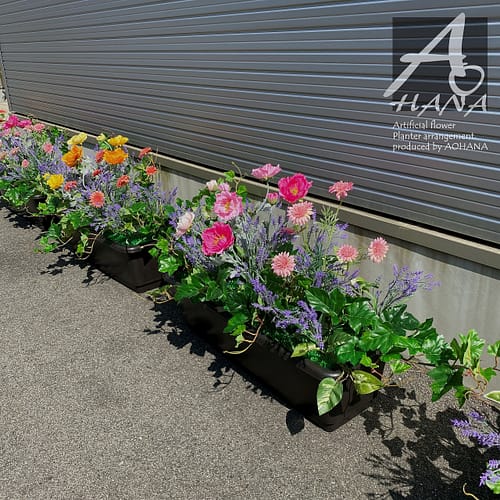 工事施工業者様より工事現場事務所の環境対策用に造花プランターをオーダーいただきました。外水道のない環境の現場事務所とのことでした。真夏の期間限定でしたのでお水やりの手間もかからずお喜び頂けました。