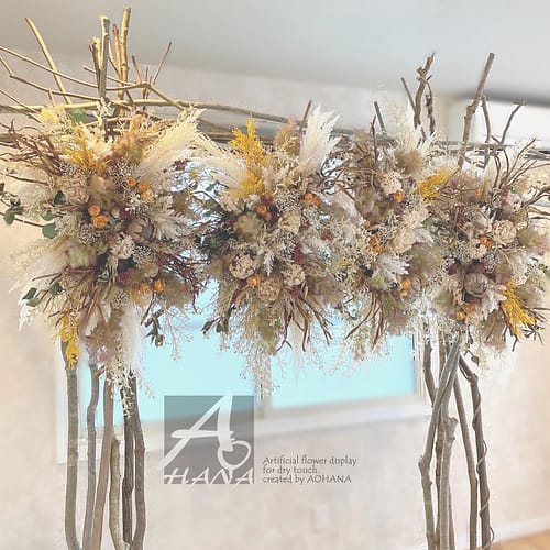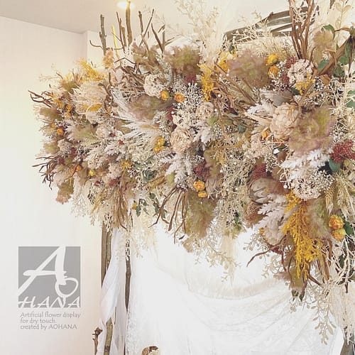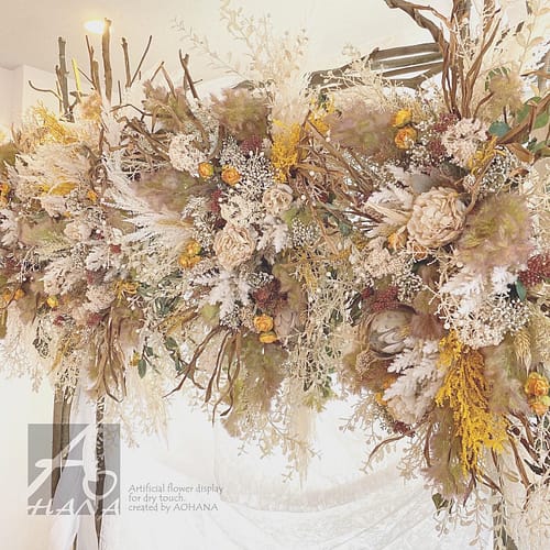 フォトスタジオ用の撮影ブースの装飾です。当店でもオーダーの多いドライフラワー風造花を使用した大型ディスプレイを製作させていただきました。