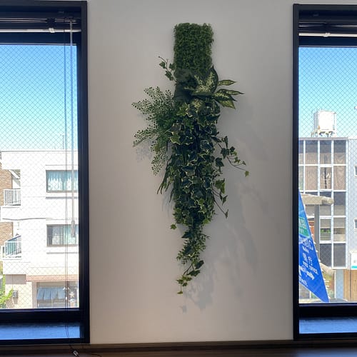 30cm×90cmのグリーンベースに同花材で3パターンデザインの緑化パネルを設置いたしました。