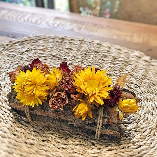 ポプラの木を使ったAOHANAのオリジナルベースにヘリクリサムとミニバラをアレンジしたドライフラワーオブジェです。