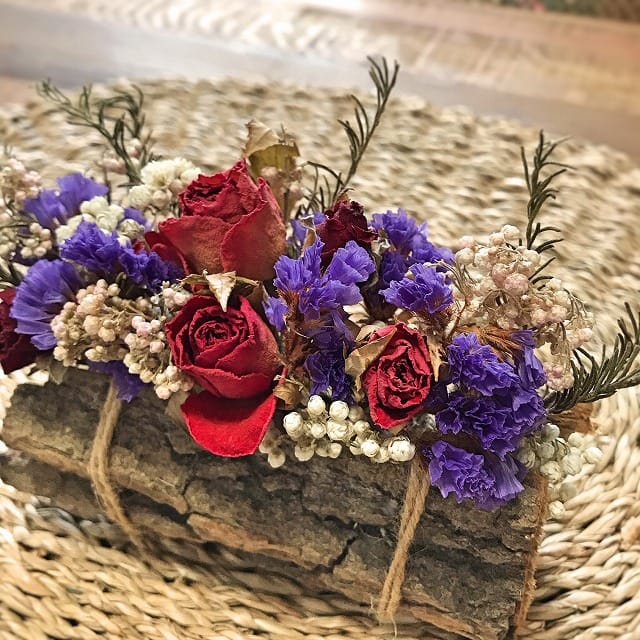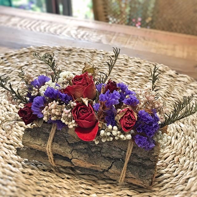 ポプラの木を使ったAOHANAのオリジナルベースにミニバラとスターチスをアレンジしたドライフラワーオブジェです。