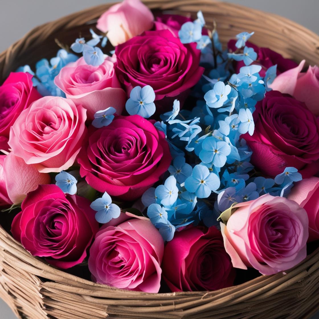 ピンクバラ7割 青い小さい花3割の花がランダムに敷き詰められた画像