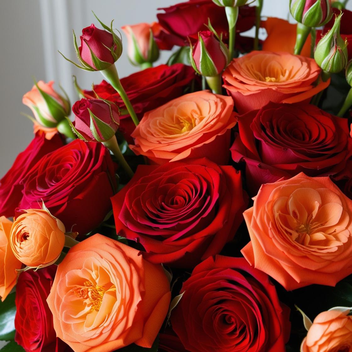 メインカラー赤とサブカラーオレンジのフラワーアレンジのイメージ画像 バラのみ