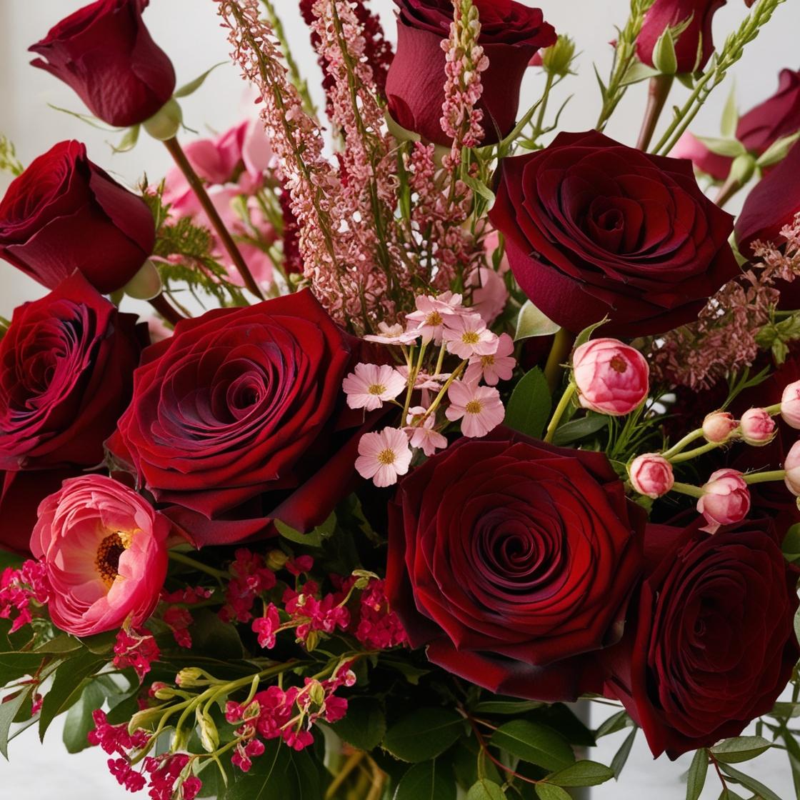 赤いバラ7割 ピンクの小さい花3割の花がランダムに敷き詰められた画像
