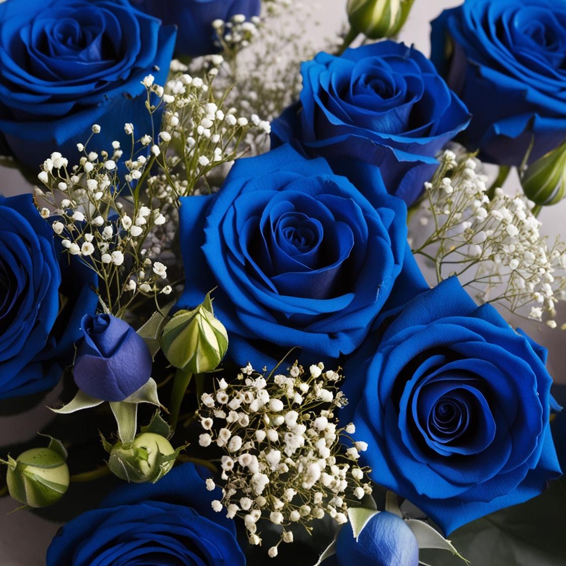 青いバラ7割 白小さい花3割の花がランダムに敷き詰められた画像