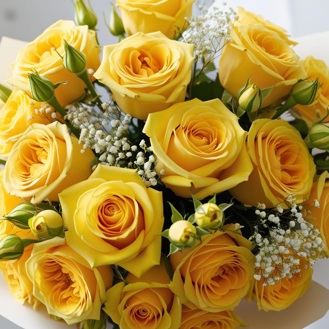 黄色いバラ7割 白の小さい花3割の花がランダムに敷き詰められた画像